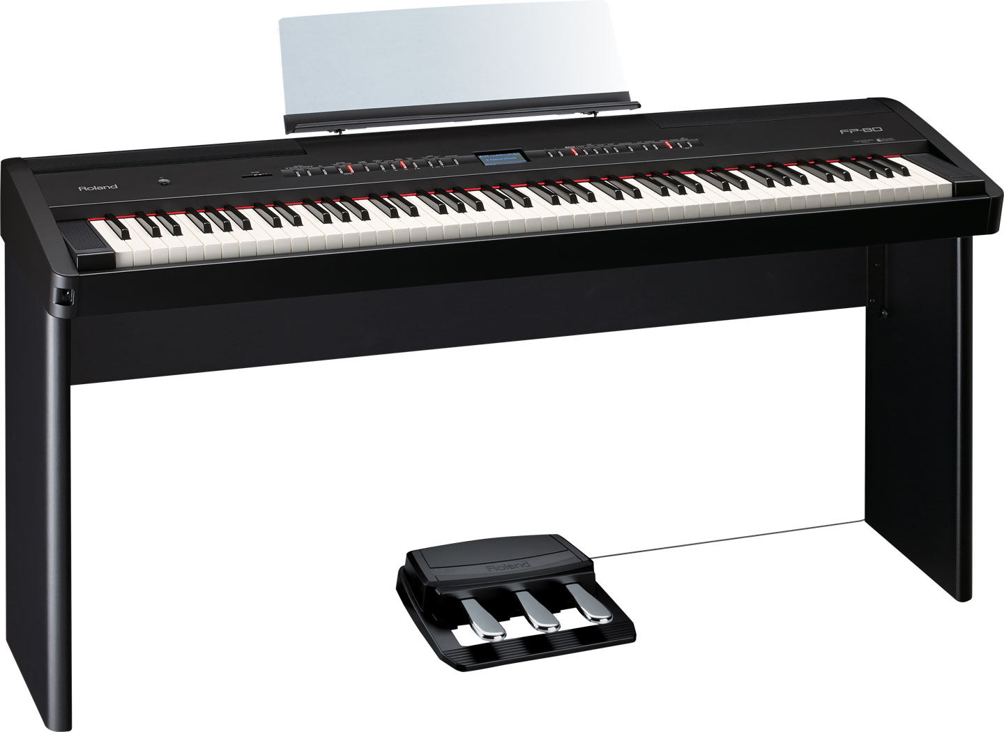 Disponível com acabamento preto (FP-80-BK) ou branco (FP-80-WH); Compatível com o pedal de Damper DP-10 (incluído) ou pedal triplo RPU-3 (opcional); Suportes compatíveis opcionais: KSC-76 (para utilização doméstica) e KS-12 (para utilização em palco).